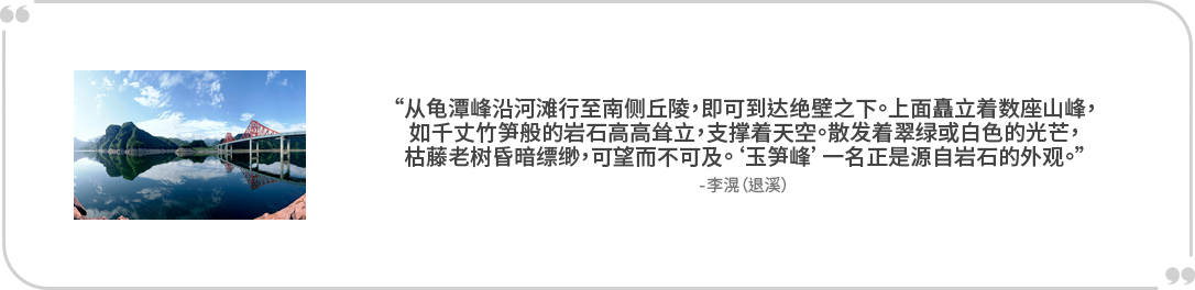 玉笋峰自古就以美景吸引着无数著名画家和文人骚客。其中还有一段著名的轶事。李滉(退溪)当时任丹阳郡守,向清风郡守请求将玉笋峰划入丹阳,但却惨遭拒绝,于是便在玉笋峰的岩壁上刻上了“丹丘洞门 (丹阳的关门)”四个大字。可见就连博学的退溪先生也对玉笋峰情有独钟。金弘道(檀园)先生也无数次到访清风的南汉江江边,用实景山水画法将“玉笋峰图”纳入画册,垂直的山峰直冲云霄,描绘出格外神秘的意境。(湖岩美术馆馆藏)此外,地理志《东国舆地胜览》中高度称赞这里是“奇妙的山峰交相辉映,就像来到了锦江。座座山峰相连形成绝妙山势,起伏沟谷自然奔放,充分展现了自然之美。”李重焕先生在《择里志》中描写了这里的绝美景色,称“玉笋峰的无数山峰完全由石头构成,直冲云霄,仿佛巨人手牵着手。”