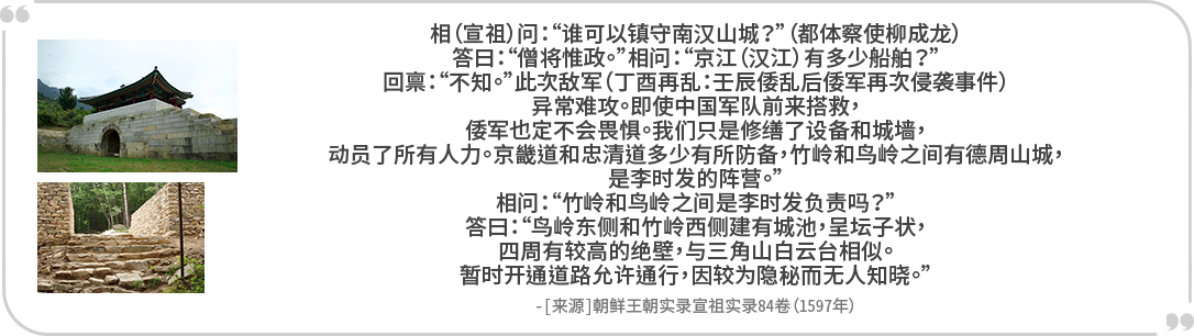 德州山城除四重山城这一特点外,还到处布有水源(溪谷),毫不夸张地说,这里就是天赐要塞,在历史中也多次登场。首先最著名的故事就是蒙古第八次入侵当时,忠州城沦陷,附近居民到这里避难。蒙古军队一路追杀至此,想要对此地实施攻击,却突见天降异象,乌云密布,强风、惊雷、暴雨和冰雹齐下,受惊的蒙古军队认为“这里是神仙庇佑之所”便主动退兵。另一个故事则与明成皇后闵氏有关。明成皇后因在与兴宣大院君的政治势力斗争过程中呈现败势,便下令将这里作为月岳宫(离宫)建造宫殿,并于1894年竣工。但是,明成皇后却因乙未事变惨遭日帝杀害。随后日帝拆除别宫,重新盖房使用。现在的月岳宫遗址仅隐约留下了位于寒松小学门前的遗址。