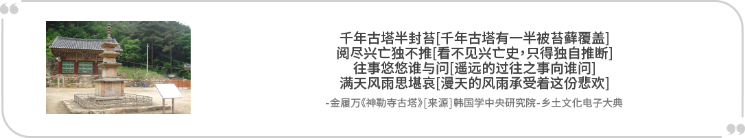 神勒寺由新罗时期的阿道和尚于582年创建,随后由元晓大师修建,又经过无学大师、四溟大师等著名禅师重建,是保留至今日,拥有千年历史的古刹。在壬辰倭乱战火下一度成为废寺的神勒寺经数次修缮,最终形成了如今具备山神阁、寺舍的样貌。规模虽小,但以千年历史著称,到处都是独特的文化遗产。最有名的当属韩国宝物第1296号——神勒寺三层石塔。神勒寺三层石塔是典型的新罗末期、高丽初期的石塔样式,被评价为研究当时石塔的重要资料。1981年解体修复时,在基台内部发现108个小塔和舍利函片等,这些文物如今都被收藏于国立清州博物馆,向大众公开。此外,还可以在这里参观到于朝鲜中叶重修的神勒寺极乐殿(忠清北道物质文化遗产第132号),以及以华丽色彩为特点的极乐殿壁画和丹青(忠清北道物质文化遗产第301号)等。
