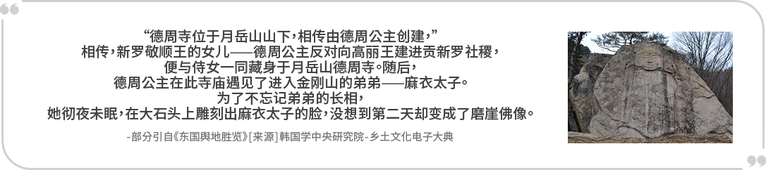 当然,不得不提的还有《麻衣太子和德周公主》传说中出现的磨崖佛,该佛像已被指定为韩国宝物第406号。磨崖佛展现了新罗末期、高丽初期的重要石佛样式,不仅拥有作为文化遗产的极高价值,还被赋予了可以感受到亡国悲痛和姐弟之间美好亲情的传说,使得其价值更是大放异彩。与磨崖佛有关的传说是在庆州,麻衣太子和德周公主一行人到达月岳山,感觉像是来到了风景如画的金刚山,便在这里停留。麻衣太子变成了弥勒佛,德周公主变成了磨崖佛,一年只能相见一次(实际上磨崖佛向南,弥勒佛向北,方向极其独特)。还有这么一说,因想念前往金刚山的麻衣太子,德周公主无法忍受对弟弟的思念之情,便化身为磨崖佛。