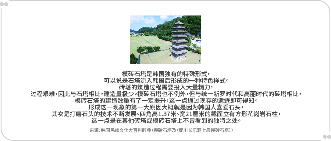 长乐寺址七层模砖石塔(宝物第459号):模砖石塔的形式在韩国实属少见,将石头削成砖头模样后堆积成塔,因为是汇聚砖头并模仿塔的样式搭建而成,故被称为“模砖塔”。特别值得一提的是,该塔是使用灰黑色的黏板岩搭建而成的模砖塔,现高9.1米,从塔的形式或石头加工技法可以推测,该塔建立于统一新罗末期。塔整体高7层,各层缩减比例适当,彰显庄严气韵。受韩国战争时期的严重破坏,该塔曾处于岌岌可危的状态,后于1967年解体修复。修复过程中在7层顶石上发现雕刻有花状的青铜片,由此推测形成塔顶的相轮部使用青铜制作而成。模砖石塔所在的长乐寺址,是在堤川发现的最早的三国时代佛教遗址。2003年至2006年,经过一轮勘探调查和三轮挖掘调查,出土了各种文物,是研究古代文化传播路径和堤川地区古代历史的珍贵资料。