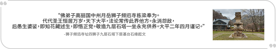 狮子频迅寺址四狮子九层石塔旨在祈求国家安宁和和平,具有很强的护国佛教性,意义尤其深远。此外,使用被称为狮子塔这一特殊形态石塔(异形塔)样式,可确定各部分结构、样式、雕刻手法等的相关年代,故可视为推定其他石塔建造年代的基准作品。从这几点来看,这座石塔堪称在韩国石塔界占据举足轻重地位的宝物。