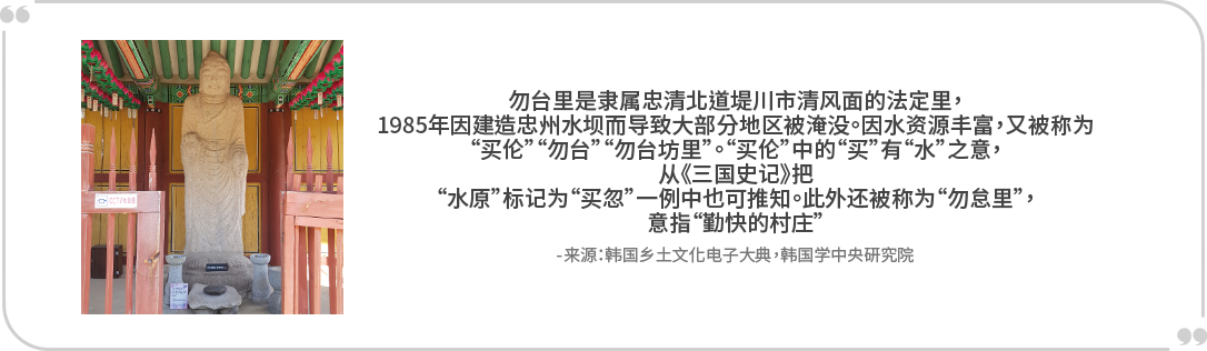 勿台里石造如来立像具有宽大的肩膀,极具丰满之感,属于统一新罗时期样式。而非真实感的手部、块体化的身体等,又属于高丽时代样式。因此,可以将其视为了解高丽时代堤川地区佛教文化的重要文化遗产。古代水资源极其珍贵,建立在多水之地,更是充分展现了菩萨朴实、厚德、慈悲的风貌。勿台里因忠州水坝建设工程而几乎被清风湖淹没,勿台里石造如来立像现在则被置于清风文化遗产园区内的保护箱内。