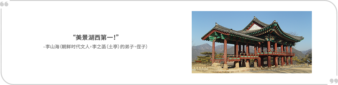 寒碧楼是韩国三大亭子之一,风景绝佳。在被水淹没前,与秀丽的自然风光交相辉映,如一幅美丽的画卷。宋时烈(尤庵)、金正喜(秋史)等著名文人都曾在此留下匾额、牌匾,可见其知名度非同一般。该楼阁原是作为客栈建于高丽后期,外观简洁淡雅。朝鲜时期憧憬自然的贤儒经常以此为题写汉诗或作画。金弘道(檀园)等在这里留下了大量画作,柳成龙、权尙夏、丁若镛等也在这里写下了众多汉诗、诗文。寒碧楼是朝鲜时代士大夫(文人)的代表诗会场所,在这里阅读自己喜欢的诗集,也是一件极其浪漫的事情。
