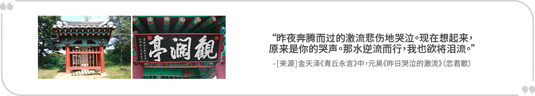 癸酉年,叔父首阳大君(世祖)篡位,夺取侄子端宗的政权(癸酉靖难),终而抢占王权。死六臣是当时反对篡位,为向端宗尽忠而密谋端宗复位,最终惨遭杀害的代表臣子。此外还有生六臣,他们果断弃官,毕生追慕端宗,隐居乡野。生六臣虽未像死六臣一般谋划复位运动,但并不承认世祖的王位,故下到地方,终身未再踏上仕途。元昊先生在首阳大君将端宗赶至宁越后,便留宿在近郊的松鹤面长谷里,即今日的观澜亭,不时向端宗请安。端宗被降为鲁山君后被埋葬于宁越,相传元昊先生为其立坛并朝夕以泪洗面,向坟墓行礼。此后,世祖虽赐其户曹参议一职,但却被他以死谢绝。元昊死后,他的子孙和儒学家为纪念其忠义,为其立碑石和亭子,并在旁边立遗墟碑表示对其悼念。观澜亭虽只是低矮的野山,但在观澜亭所见的韩半岛地形和奔流不息的平昌江,就如元昊的丹心般美丽。