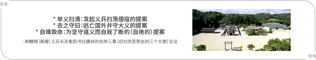朝鲜末期的儒学家柳重教(性理学者李恒老的弟子)为培养后生,于1889年建立此学堂。旧韩末期,这里成为了堤川义兵号召起义的发祥地,是为堤川义兵扩散至全国提供思想、战略基础的教育机构。柳重教供奉朱熹(朱子)、宋时烈、李恒老的画像,定期在这里进行参拜。此后,以柳麟锡为代表,继承师意的儒生于1895年面对断发令不知如何是好,后发动义兵,处决亲日官僚,开始堤川义兵的活动。日后又追加供奉柳重教、柳麟锡和李昭应等,每年春香节(阴历3月20日)、秋香节(阴历9月20日)进行祭祀。堤川市为促进紫阳影堂修缮工程,悼念堤川义兵的亡魂,建造崇义祠,供奉“湖左倡义阵”旗帜和“朝鲜末13道义军都总裁毅庵柳先生麾下诸贤神位”,并通过每年10月的堤川义兵节活动举办告由祭。