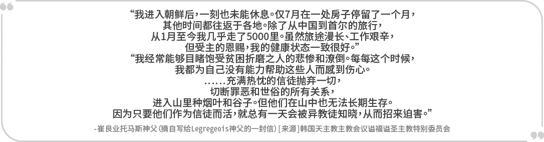 崔良业托马斯神父因受到迫害而失去了崔京焕弗朗西斯和李圣礼玛利亚,虽经常要过流离失所的流亡生活,但却始终未放弃信仰。来到首尔后,15岁的他与金大建等一同被法国传教士选为神学生,后到澳门留学,接受司祭叙品。他为了回到韩国展开活动,在中国、辽东地区司牧,在看准机会后,最终时隔13年取得成功。他每天徒步往返于穷乡僻壤,只为主持大小圣事,一天100余里路,一年就是2800余公里。他做司牧超过了11年,在此期间,不光传播天主教,还主张废除身分制度,努力推进社会改革。最后,他在前往首尔报告司牧活动情况的途中,因过劳和感染伤寒病而与世长辞。